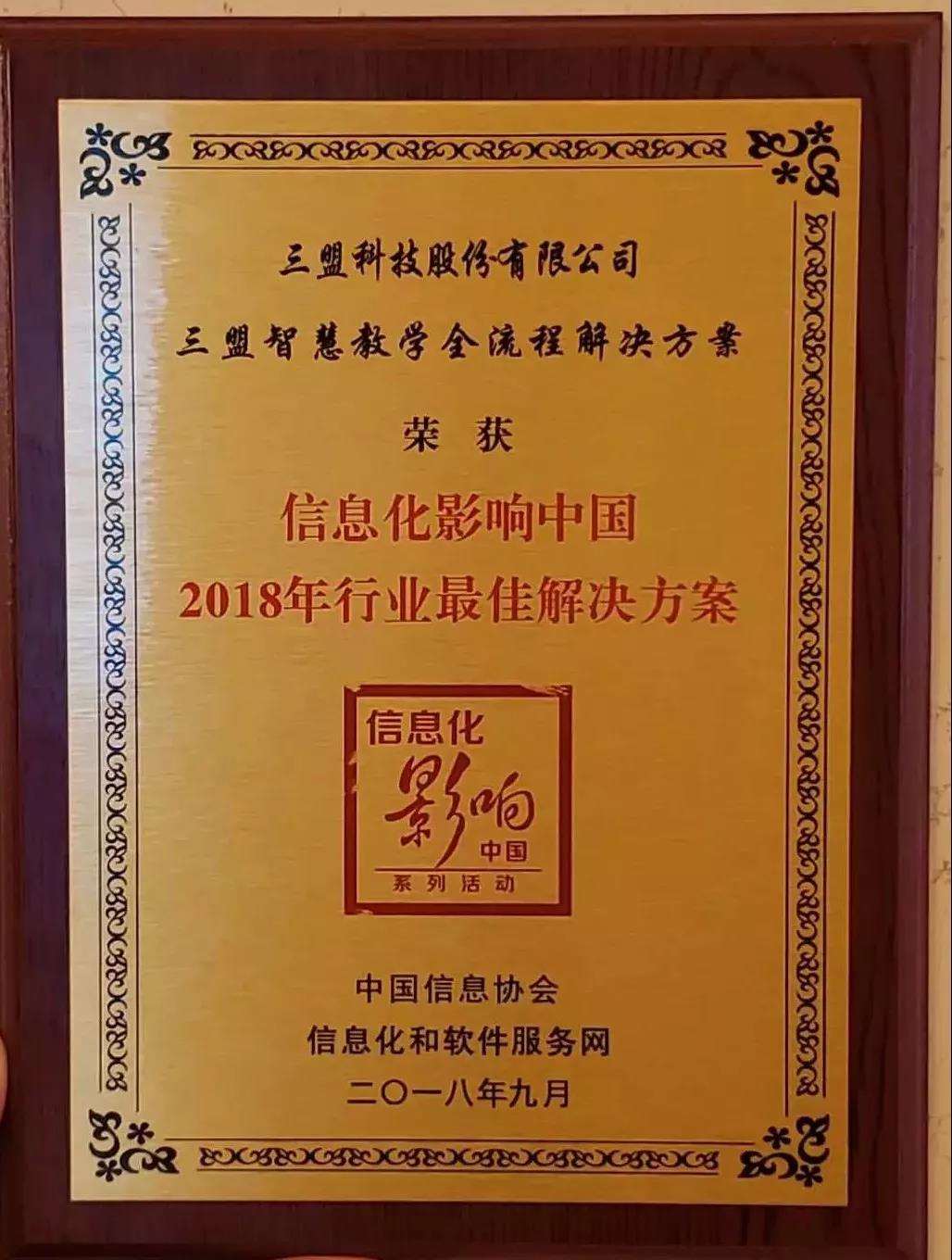 2018年9月20日,由中國信息協(xié)會(huì)主辦信息化和軟件服務(wù)網(wǎng)中國信息協(xié)會(huì)傳媒中心協(xié)辦“2018中國信息化創(chuàng)新發(fā)展大會(huì)北京舉行。三盟科技憑借在智慧教學(xué)領(lǐng)域的杰出地位,應(yīng)邀出席本次大會(huì),其三盟智慧教學(xué)全流程解決方案在“信息化影響中國·2018獎(jiǎng)項(xiàng)評(píng)選活動(dòng)”中斬獲“2018教育行業(yè)最佳解決方案大獎(jiǎng)