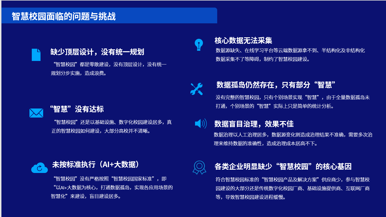 魏廣平博士表示,近年來我國的教育信息化建設(shè)水平已有很大進(jìn)步,但高校的智慧校園建設(shè)仍存在缺乏頂層設(shè)計、“智慧”未達(dá)標(biāo)、數(shù)據(jù)孤島未打通、核心數(shù)據(jù)缺失、數(shù)據(jù)治理質(zhì)量低、建設(shè)進(jìn)程緩慢等問題。