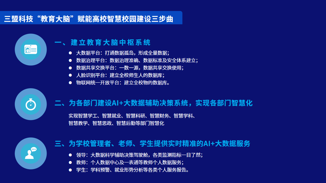 面對高校智慧校園建設(shè)中存在的問題,魏廣平博士提出智慧校園建設(shè)需要做好頂層規(guī)劃,為學(xué)校教育信息化的長足發(fā)展做好布局,借助三盟科技“教育大腦”,“三步曲”賦能智慧校園建設(shè)。