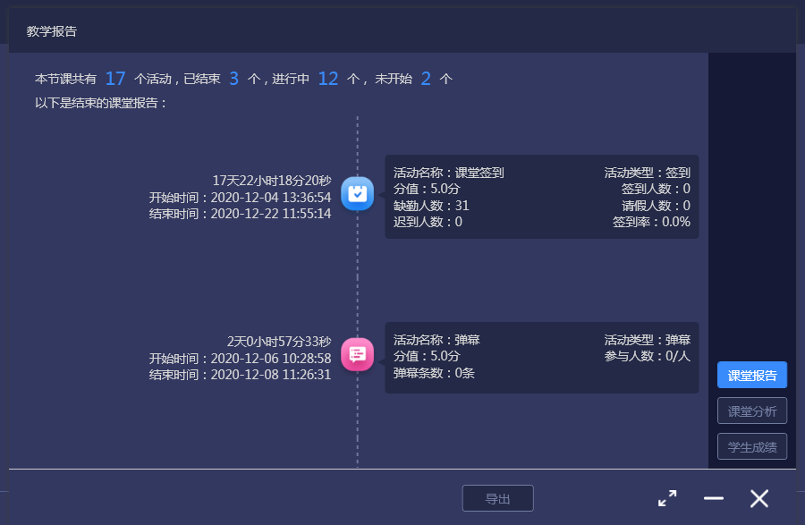 平臺還做到課后自動生成教學報告并反饋至學校的教學督導辦公室,有利于對教學環節進行質量檢測、監控,全方位保障教學質量。