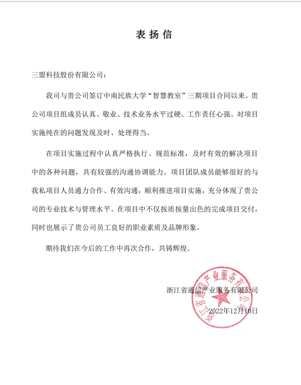 三盟科技與浙江省通信產(chǎn)業(yè)服務(wù)有限公司就中南民族大學(xué)智慧教室三期項(xiàng)目簽訂合作,期間三盟科技項(xiàng)目實(shí)施團(tuán)隊(duì),精誠團(tuán)結(jié)、科學(xué)組織,憑借認(rèn)真、敬業(yè)、技術(shù)水平過硬、工作責(zé)任心強(qiáng),對(duì)項(xiàng)目實(shí)施過程中存在的問題發(fā)現(xiàn)及時(shí)、處理得當(dāng),獲得校方和合作伙伴同事的高度認(rèn)可,高品質(zhì)完成既定目標(biāo)。