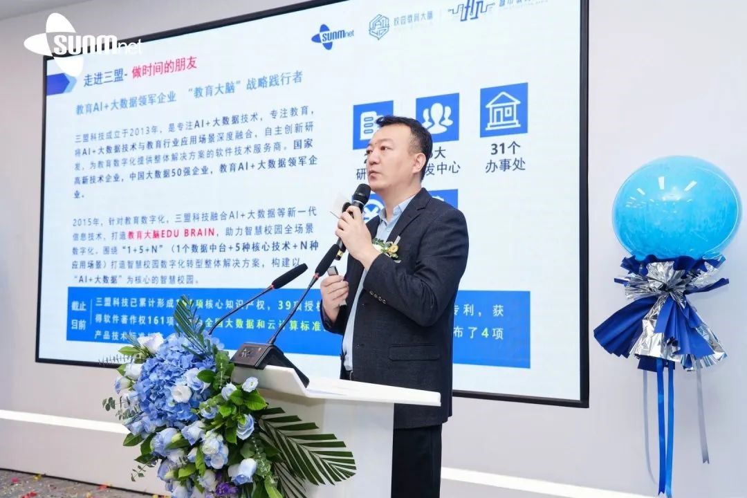 三盟科技高級副總裁孫國文先后帶來《新三盟創新戰略變革報告》和《基于湖倉一體的數據中臺的教育大腦解決方案》兩大主題報告。分享了三盟科技歷經企業六大戰略變革之后的全新蛻變,并向嘉賓介紹了三盟科技“教育大腦”智慧校園整體解決方案在助力高校構建全量數據底座,落地教育全場景數字化解決方案的建設路徑及成效。