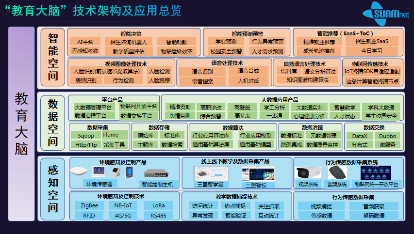 “工欲善其事必先利其器”,2018年三盟科技重磅推出的“教育大腦”戰略,將大數據、人工智能、物聯網等技術,應用于教育信息化2.0建設,其基于AI+大數據的智慧校園建設,包括智慧教學環境、智慧教學資源、智慧校園管理、智慧校園服務等全系列完整解決方案,實現在滿足智慧校園建設標準的基礎上進一步提高高校的教學、科研、管理水平,促進高校的快速發展。