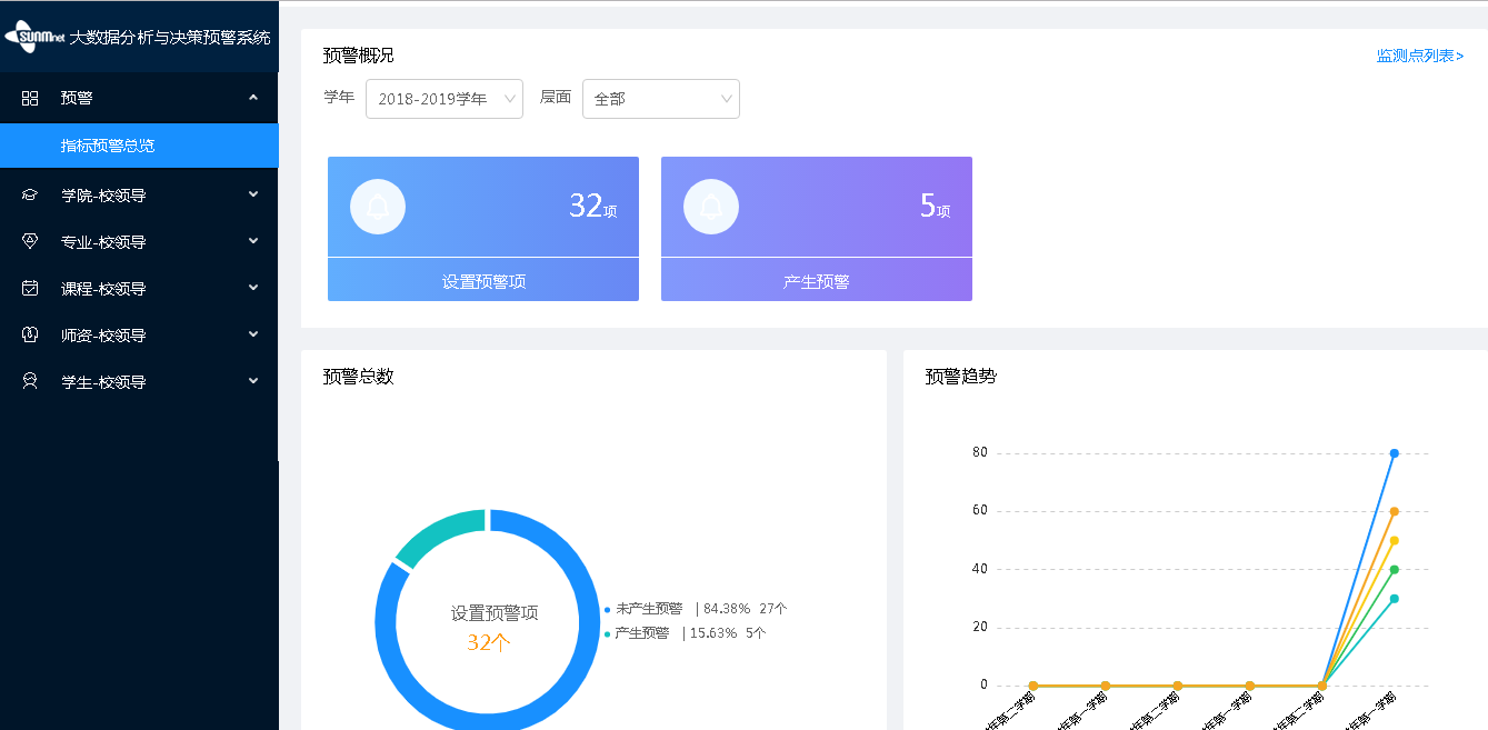 現在,大數據分析與決策預警系統提供診改決策數據支持及“五橫”畫像分析展示,具體提供包含學校、專業、課程、師資、學生維度的畫像展示。并且具有單獨的預警模塊,實時、動態的掌握全校發展,為及時糾偏提供大數據的支持。