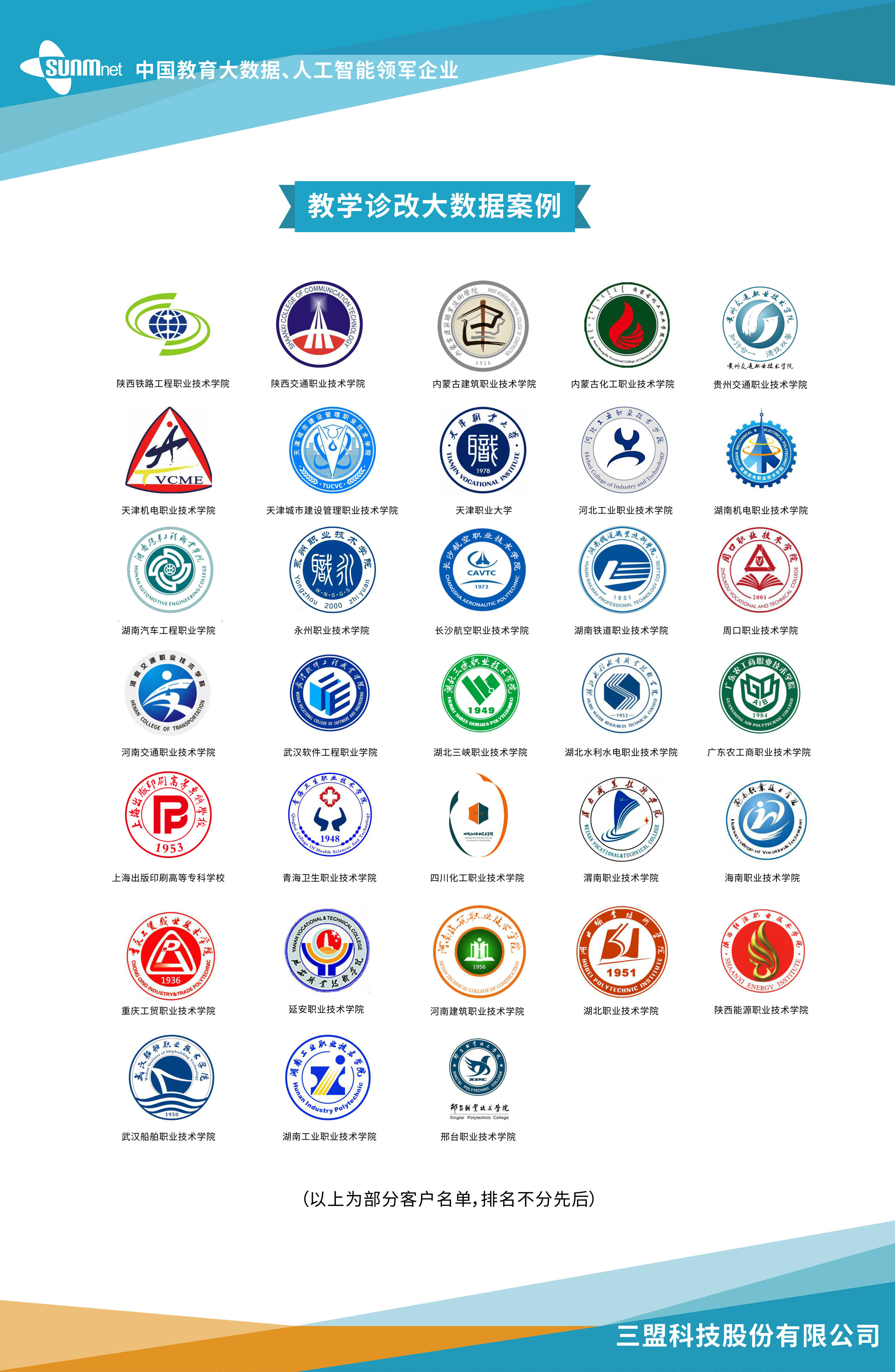三盟科技通過幾年的不懈努力,現在實際診改落地案例達36,其中包括5所教育部確定的27所高職診改國家試點院校陜西鐵路工程職業技術學院陜西交通職業技術學院兩所院校目前已順利完成國家復核;另外,三盟參與建設的9所院校也順利完成省級復核。通過豐富的實施經驗,三盟科技已經建成了一套科學、專業、高效的教學診改大數據平臺。