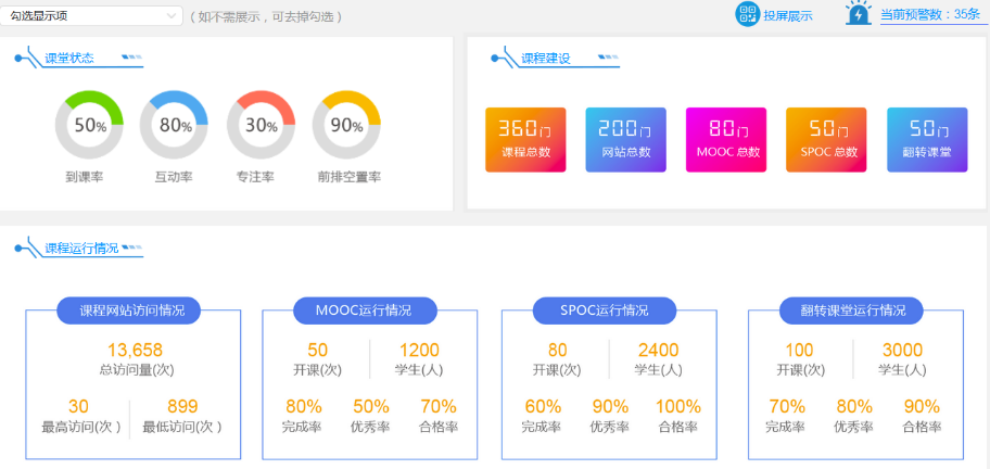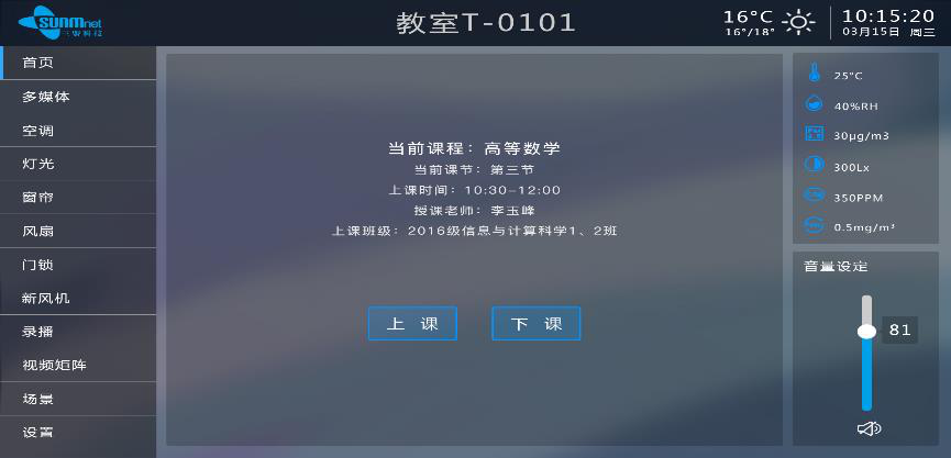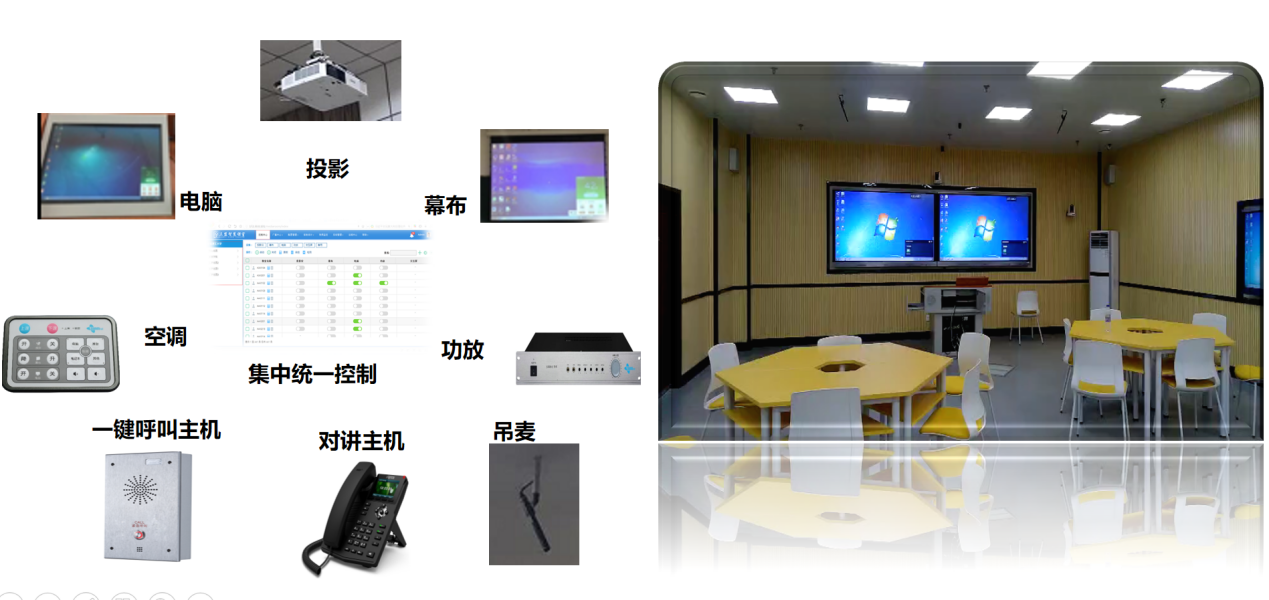 包含教學設備管理、教室使用管理、集控錄播錄制管理、信息發布管理、遠程交互管理等系統,采用拼接屏進行多屏展示,可以讓管理者實時遠程查看不同教室各種設備的完好情況,并可遠程控制各種設備,該平臺與教學管理系統對接,并可通過一鍵尋呼系統尋求遠程救助,管理者在主控室可實時查看教室的排課情況與使用情況。
