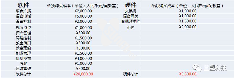 三盟智校軟硬件含以上所有內容單間教室成本¥12000元,單獨購買以上12個子系統每間教室成本¥25500,每間教室在符合智慧校園智慧環境標準的前提下,每間教室節約53%的整體建設成本。