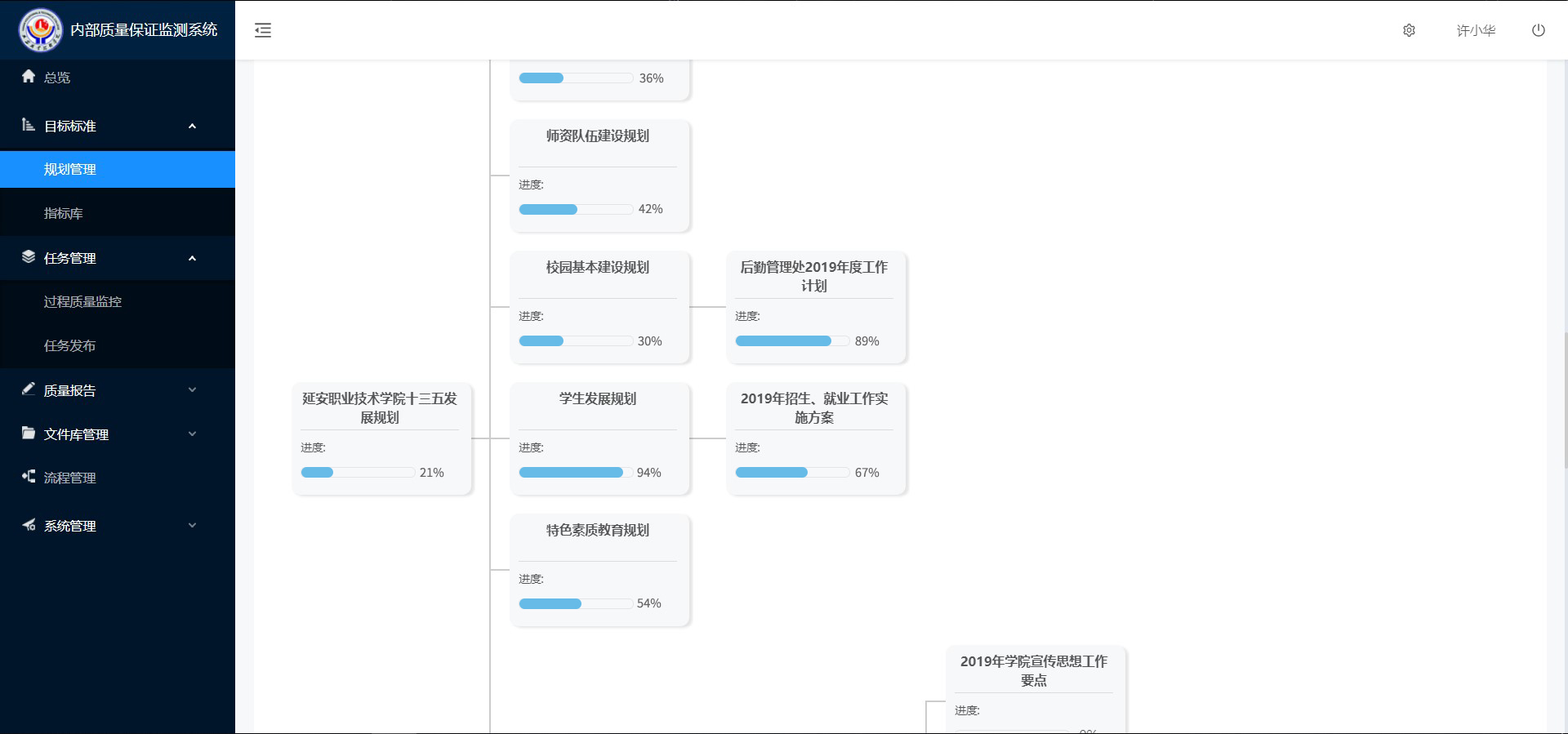 內部質量保證監測系統針對學校診改體系提供不同對象診改指標的詳細管理操作,并提供大數據的深度分析,實現管理、監控、預警,實時診斷和分析,可通過趨勢圖、柱形圖、雷達圖等查看指標完成趨勢及完成進度及分析。提供任務規劃的具體管理,并直接關聯績效考核,貫穿診改工作事前、事中、事后全過程。