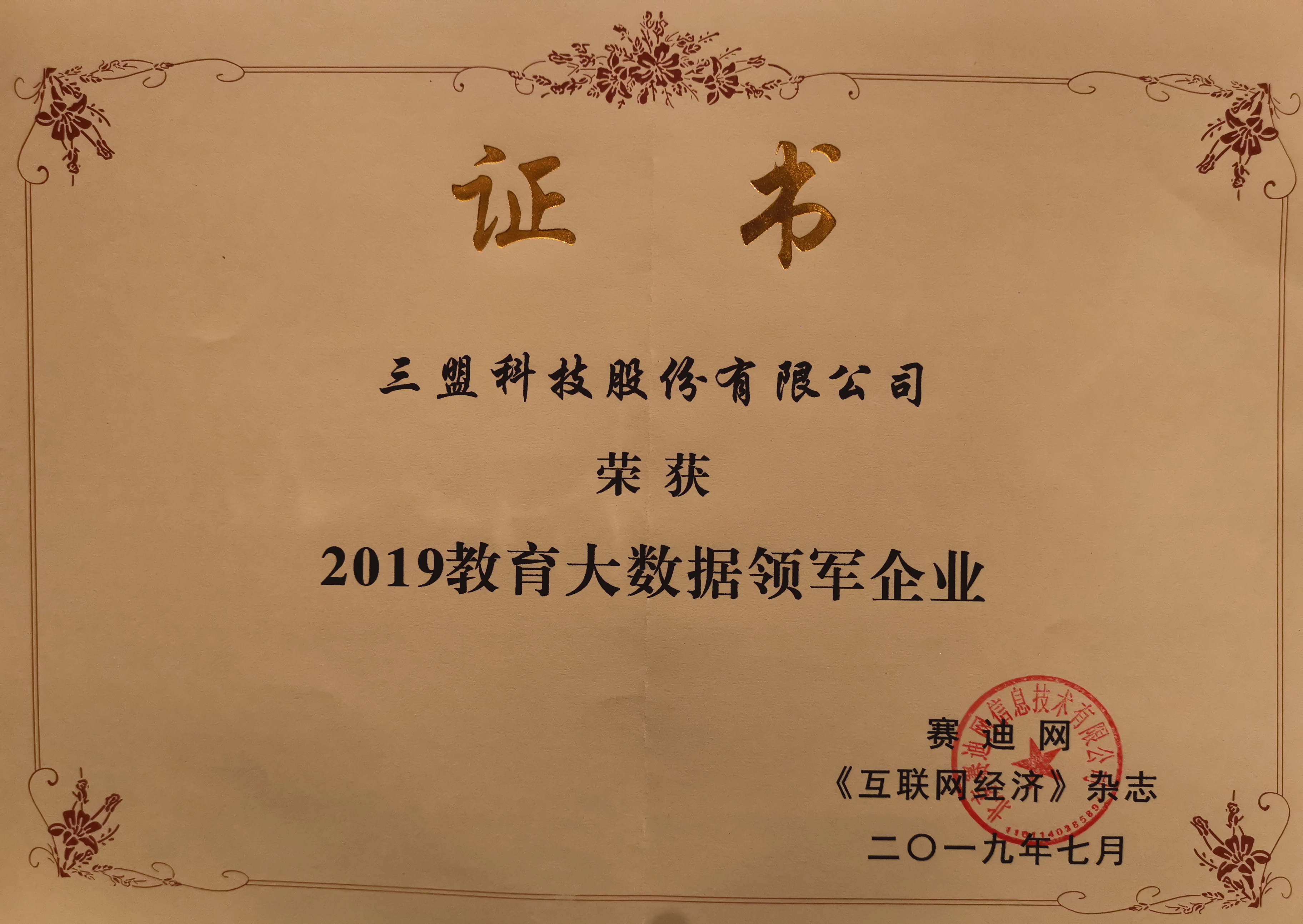 7月26日, 2019行業(yè)信息化技術(shù)創(chuàng)新發(fā)展峰會暨行業(yè)信息化獎項評選在北京隆重舉行, 在一年一度的行業(yè)信息化獎項評選中,三盟科技再次榮膺“2019年度教育大數(shù)據(jù)領(lǐng)軍企業(yè)”稱號,這是三盟科技自2016年起連續(xù)第三年榮獲該項榮譽。